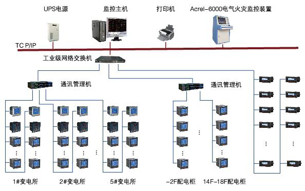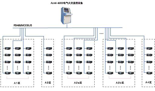 大型建筑群,樓層高,多棟樓體分散。采用Acrel-6000/Q電氣火災(zāi)監(jiān)控設(shè)備+Acrel6000/B電氣火災(zāi)監(jiān)控設(shè)備+電氣火災(zāi)監(jiān)控探測器三層結(jié)構(gòu)組網(wǎng)模式,便于區(qū)域化管理,采用RS-485網(wǎng)絡(luò)通信,以太網(wǎng)通信,滿足了通信實(shí)時性高的要求。